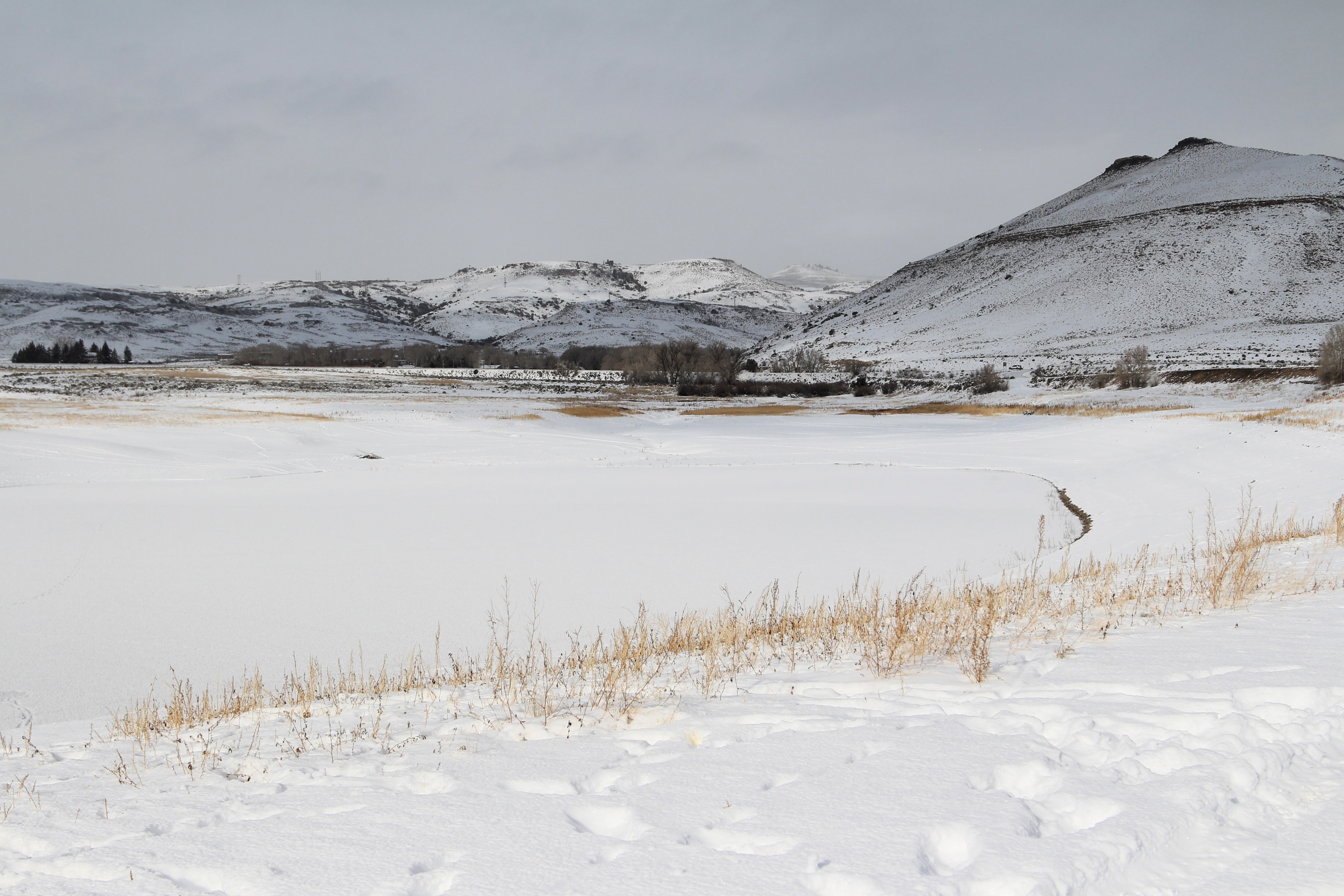 Snow covers a frozen body of water surrounded by mesas. The shoreline has yellow-brown grass and snow with footprints.