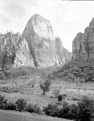 The Great White Throne from across the canyon floor, road in foreground. ; ZION Museum and Archives Image 13361 ; ZION 13361