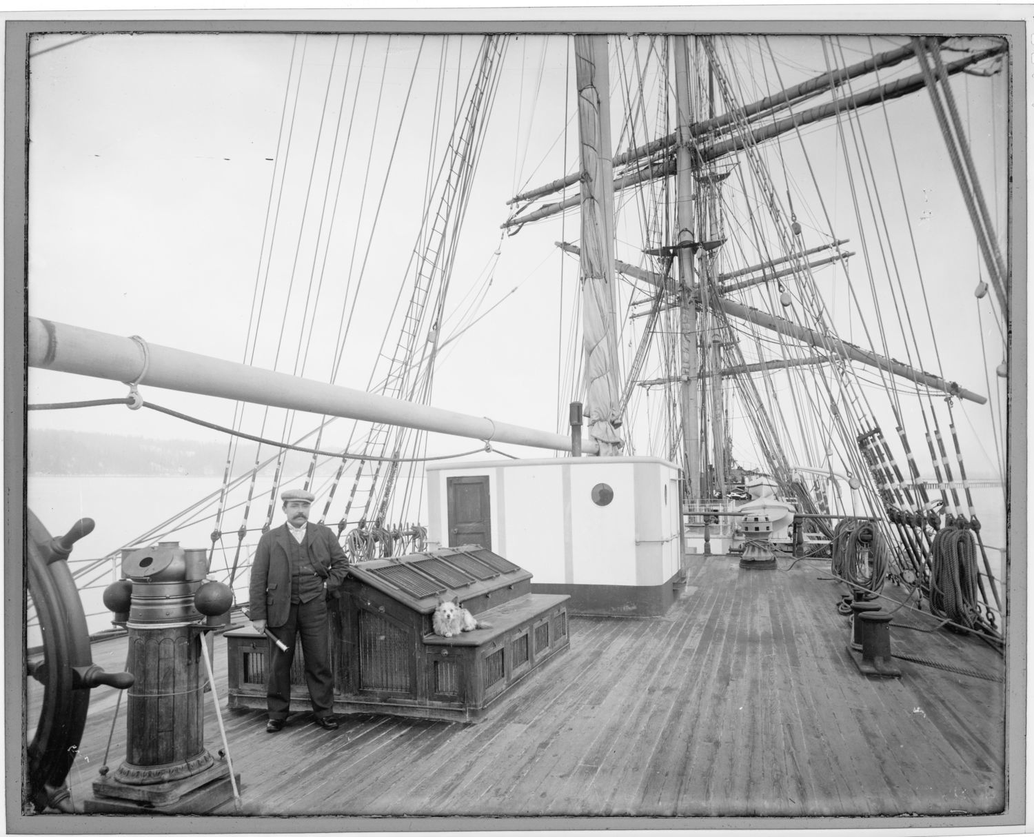 Looking forward on poop deck; shipmaster in front of skylight; dog on skylight.[CR]Updated by T. Horton, 16 Jan 2001 from information derived from verso of print donated by Dolores Plumb (P01-027). Originally listed vessel as unidentified and incorrect date range. See also photo number F6.12232.