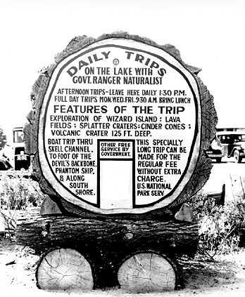 Sign at Rim Area of Crater Lake National Park advertising daily trips on the lake with Ranger-Naturalist