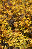 A close view of a shrub with bright yellow leaves tinged with red.
