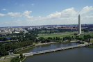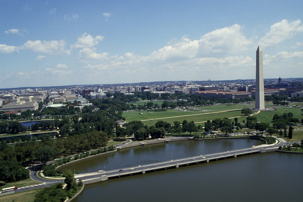 Aerial view with a focus on the Potomac River Tidal Basin and the Washington Monument, Washington, D.C.