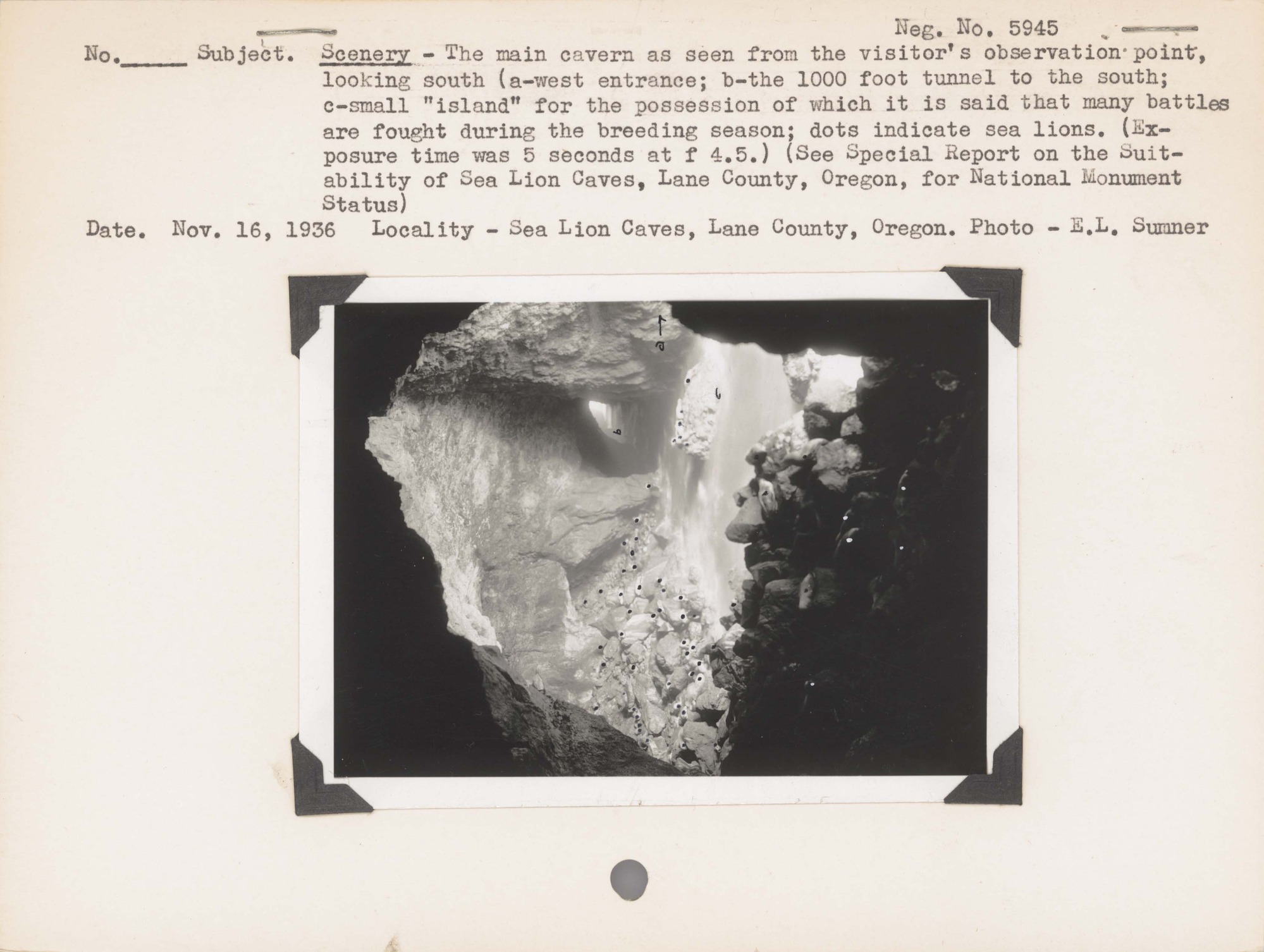 Scenery – The main cavern as seen from the visitor’s observation point, looking south ( a -- west entrance; b – the 100- foot tunnel to the south; c – small “island for the possession of which it is said that many battles are fought during the breeding season; dots indicate sea lions. (Exposure time was 5 seconds at f 4.5) (See Special Report on Suitability of Sea Lion Caves, Lane County, Oregon, For National Monument Status). Negative#: 5945. Location: Sea Lion caves, Lane County, Oregon.