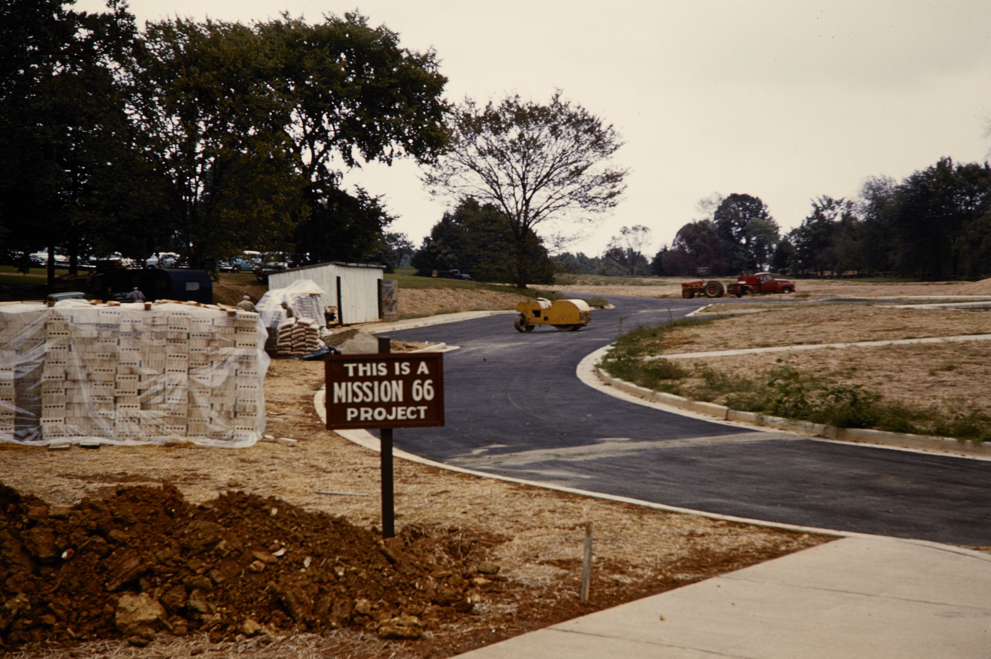 Mission 66 roads being built with a sign that says it is a mission 66 project.