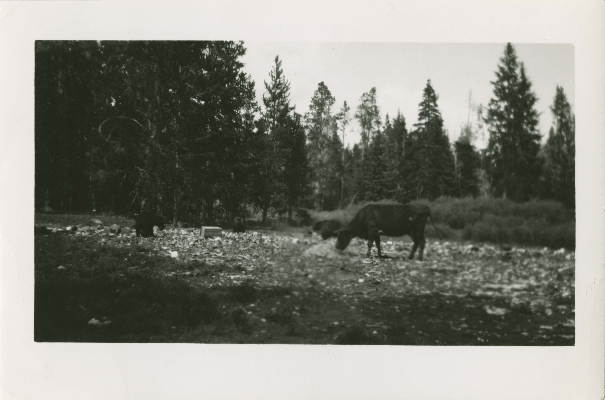 Cow and bears at garbage dump. Locality: Yellowstone National Park. Location of Negative: E.T. Scoyen, Kings Canyon National Park personal property. [The more specific date and location comes from the reverse of the envelope for this negative number. Envelope specifies date of "about 1915"]. No negative on file.