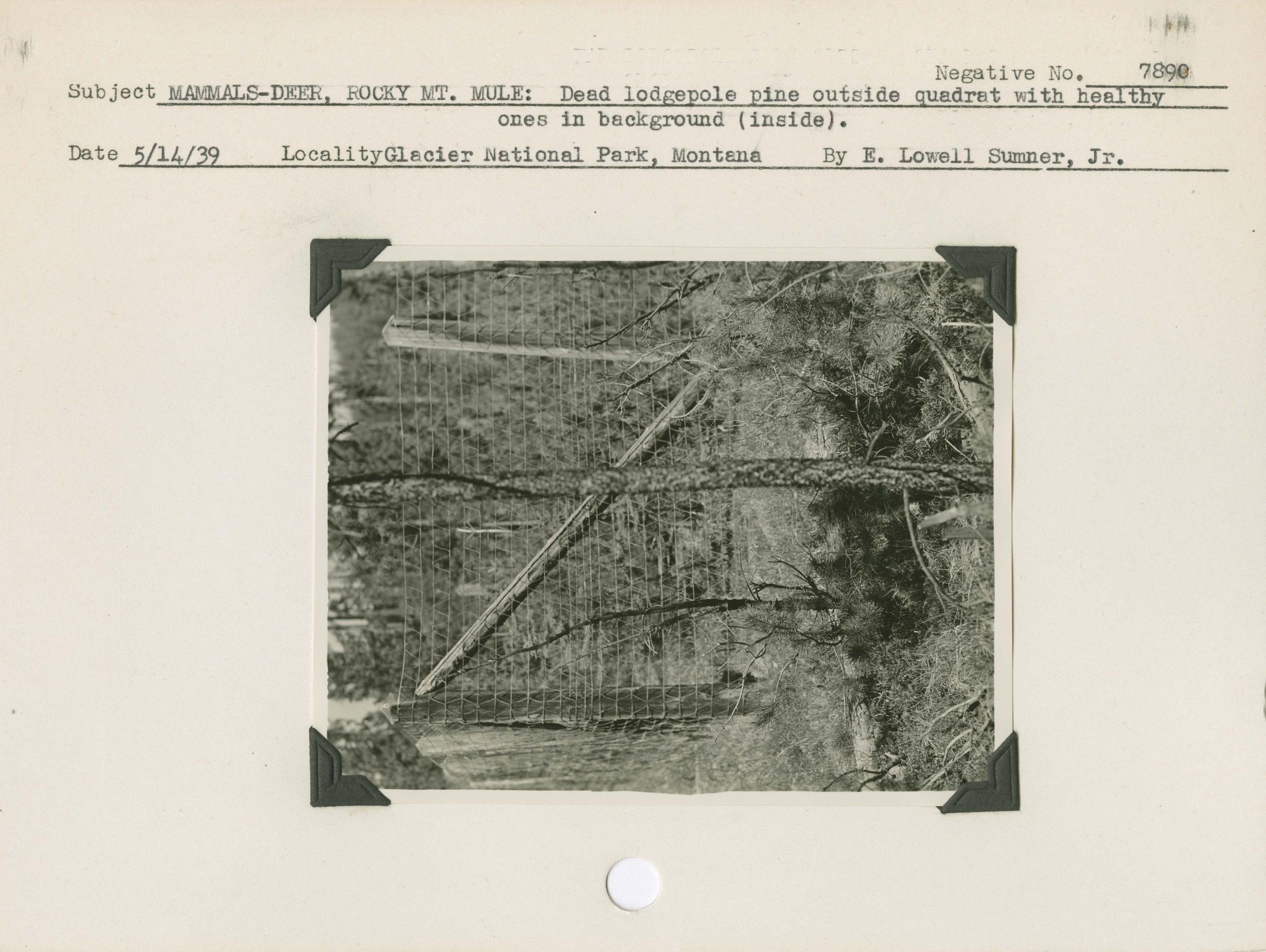 Mammals – Deer, Rocky Mountain Mule: Dead lodgepole pine outside quadrant with healthy ones in background (inside). Negative #: 7890. Locality: Glacier National Park, Montana.