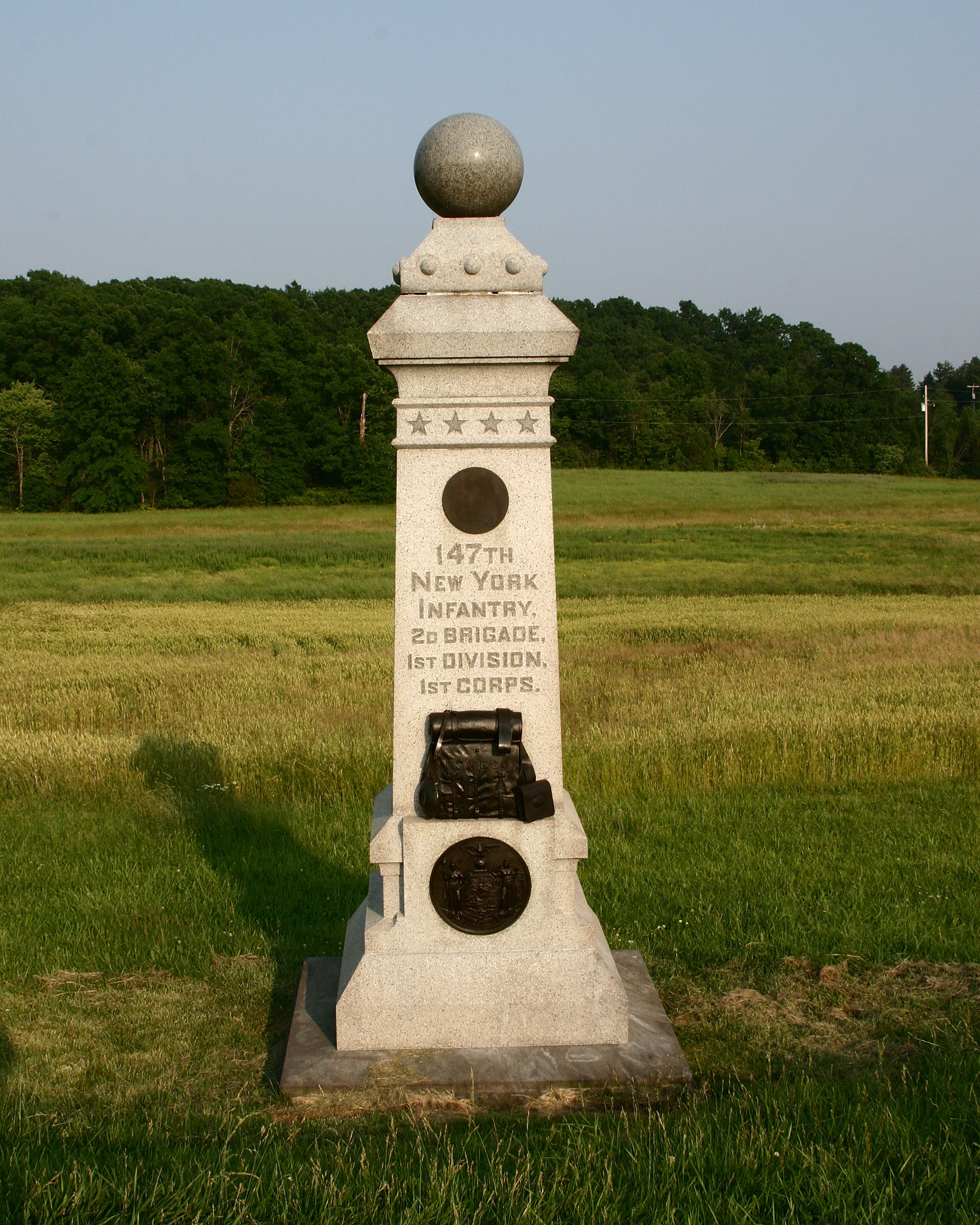 Marks position held by 147th New York Infantry on morning of July 1, 1863 when attacked by Davis's Brigade. 1 of 90 Mns in Park to New York commands in Gettysburg Campaign. Located on E of N Reynolds Ave, N of RR cut on 1st Day Battlefield. || Mn, 2 flank markers, 1 position marker. Rough base, 7'sq. Smooth shaft w/ apex top & encircled number, all 15'8" high. Bronze state seal & accoutermonts attached. Flanks, rough, flat tops, 1'x1'x6". Position marker polished w/ incised text.