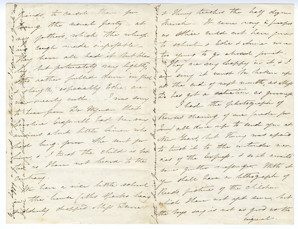 I intended to have sent both you & Lizzy a note, with the little box, but Xmas is a very hurried time, & I was absorbed in getting up a Xmas Tree for the children, & some of their little [p. 2] friends, to console them for losing their usual party at my father’s, which the whooping cough made impossible – They have all had it but Charley, but fortunately very lightly, &, tho rather pulled down in flesh & strength, especially Edie, are now nearly well. I was sorry to hear from Dr Wyman that Caroline Croswell had been very anxious about little Simon who had lung-fever. She sent for him, & I trust the child is better, as I have not heard to the contrary.