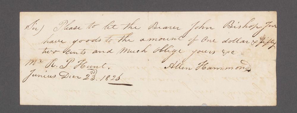 On front of document: "Sir, Please to let the Bearer John Bishop Jnr have goods to the amount of One dollar & fifty two cents and Much oblige yous & c Allen Hammond Mr R.P Hunt. Junius Dec 23rd 1826" On back of document: "A Hammond"