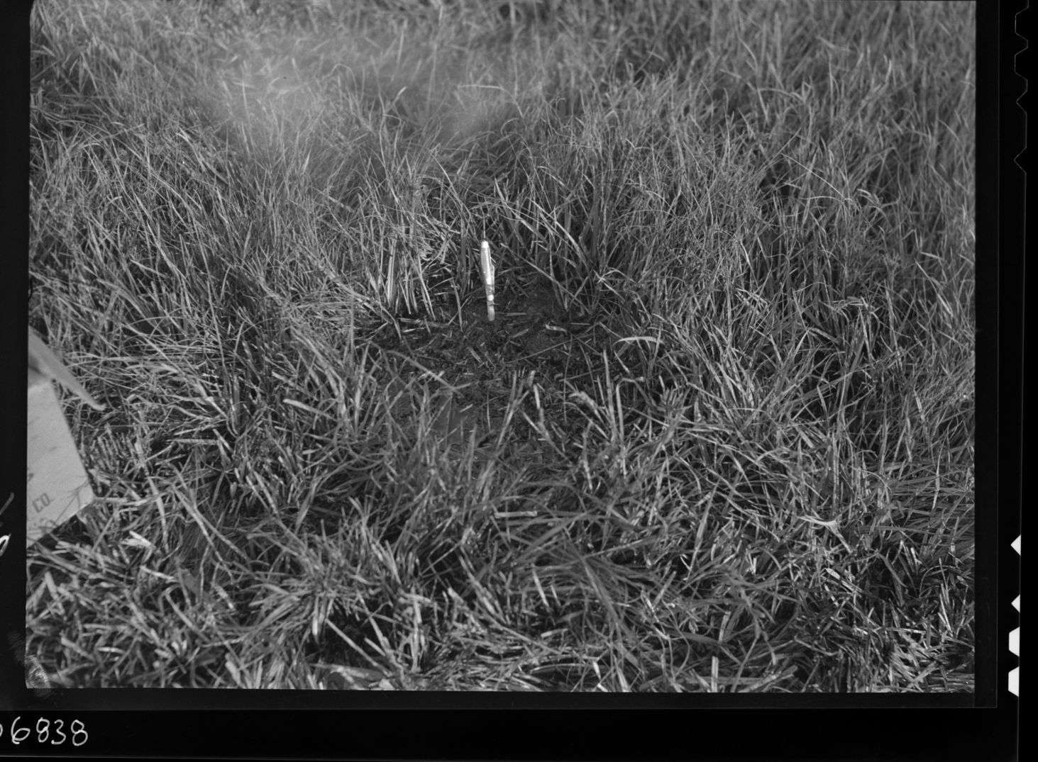 Meadow studies, detail of two foot square plot cut in meadow. Grass in good condition, 8 to 14" tall. Protected by old deer carcass. Research plots. Light leak.
