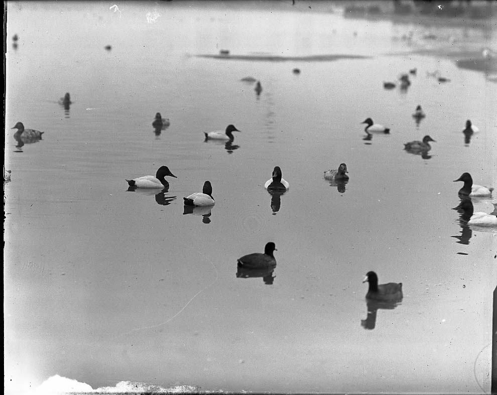 3 male canvasbacks, Lake Merritt, Oakland, CA, February 16, 1919, 12m Dagor, 3@3/4, A, [glass plate], MVZ
