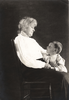 Black and white photograph of a woman seated in a chair with a young boy looking up at her