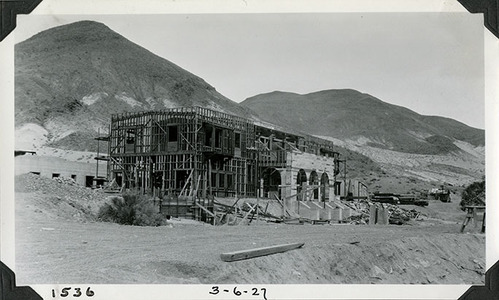 Scotty's Castle Main House, looking northeast. Wood framing in preparation for installing hollow tile walls. Great Hall roof pearlings in place. Lower Music Room windows installed. Solarium foundation formed at left. March 6, 1927. Photographed by Mat Roy Thompson. Entrance Road in foreground. Inscription on obverse in black ink on lower white border: 1536 / 3-6-27. 1536 refers to historic photograph numbering system. Black and White, 3 x 5 inch, horizontal format. Mounted with black photo corners in photograph album.