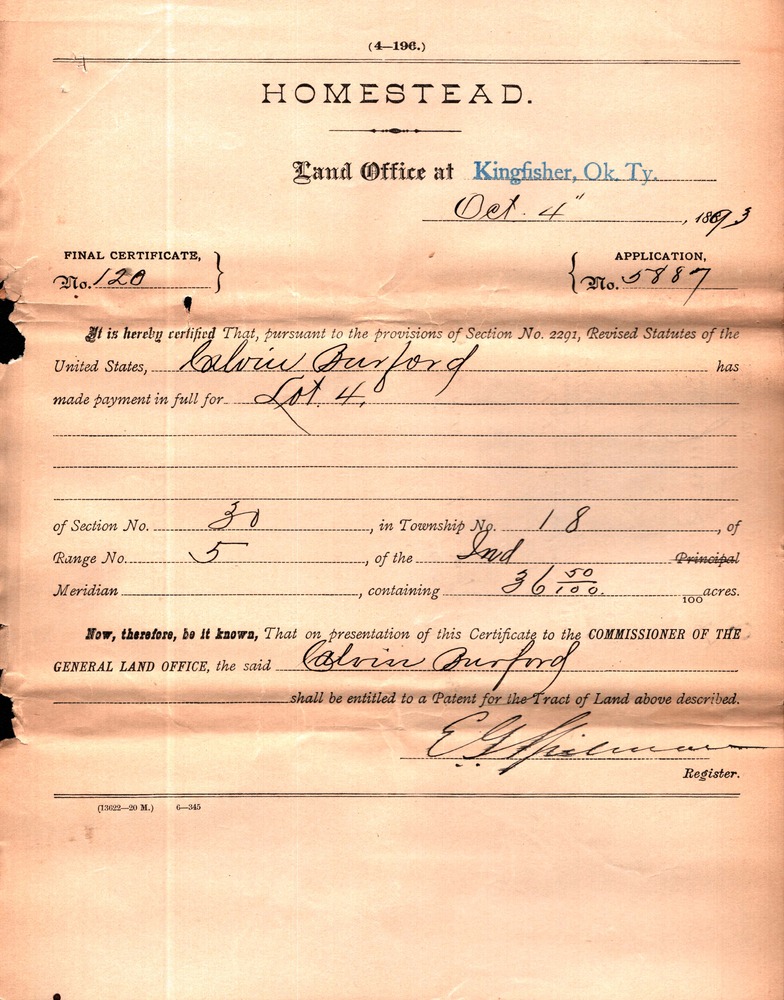 United States, Calvin Burford, has made payment in full for Lot 4, Section 30, Township No. 18, of Range