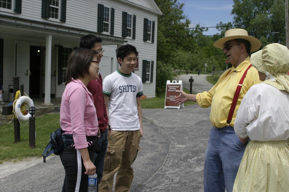 Cuyahoga Valley National Park offers a variety of interpretive programs throughout the year. Historical programs like this one interpret 19th century life in northeast Ohio. || Staff and costumed park volunteers interpret the historic structures, including a reconstructed canal lock, at Canal Visitor Center. This is one of several stations in a program that started on the Cuyahoga Valley Scenic Railroad then visitors biked back along the Towpath Trail where they met various park rangers and volunteers interpreting transportation history in the region.