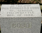 Monument erected in memory of statesman, lawyer & CSA Gen. Thomas Reade Rootes Cobb who was mortally wounded Dec. 13, 1862 near the monument location along the Sunken Road. || 18"x30" base w/ monolith shaft, 12"x24"x33"H front, chamferred to 36"H back. Smooth cut & polished w/ raised inscription in chamfer & on face of monument. Inscriptions badly eroded.