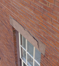 From the ground it, it appears that the brownstone lintel is weathering. Using a high lift to provide a closer inspection, it was revealed that sheets of brownstone are ready to fall off the building�s upper stories.