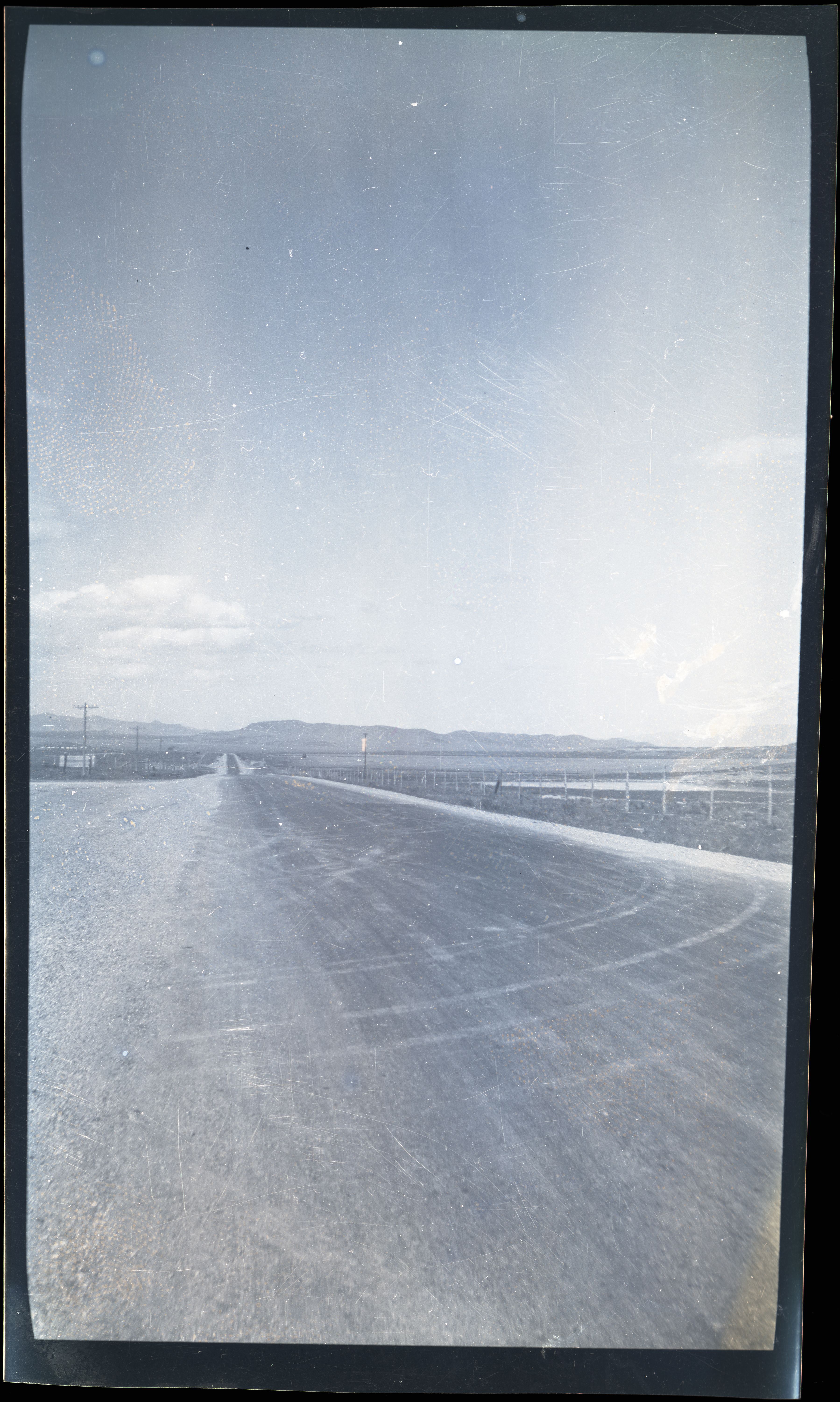 Nitrate negative of road. Fence on one side and power lines on other. Possibly Highway 12 or State Route 63 near BRCA. ; BRCA Museum and Archives Image BRCA8875_001_552 ; BRCA 8875