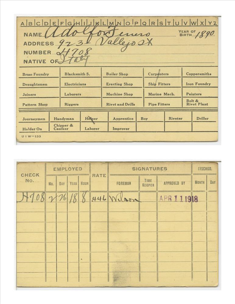 Union Iron Works Co. employee card for Ferrero Adolfo