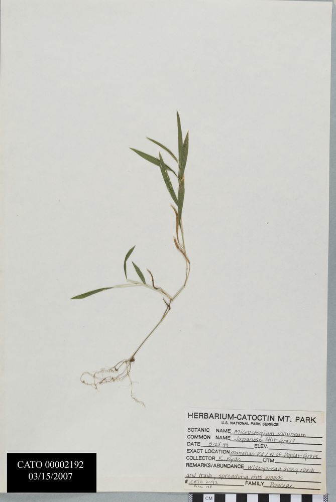 Microstegium vimineum,Widespread along roads and trails, spreading into woods.Non-native species.