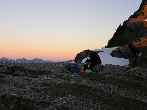 Climbers packing up camp being careful not to damage fragile alpine plants next to their camp.