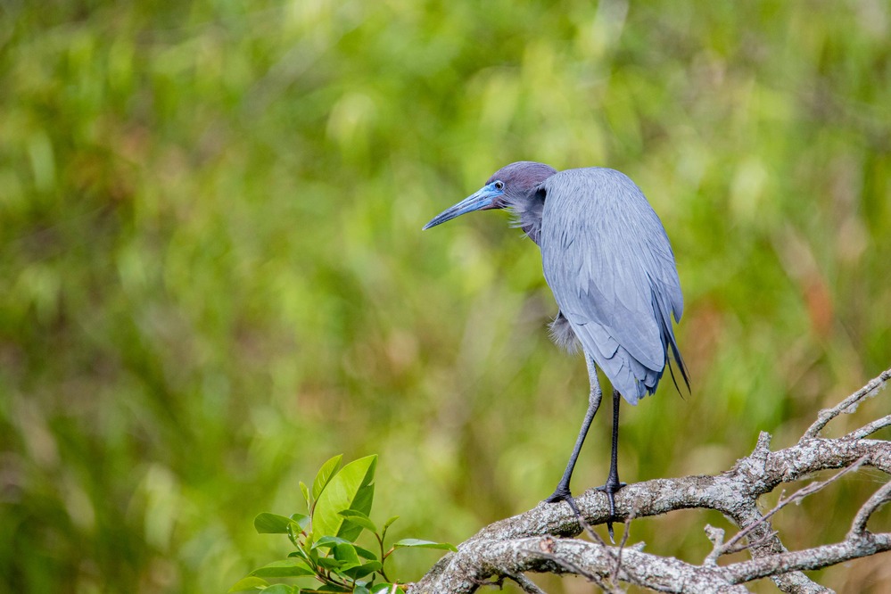 A Little Blue Heron in breeding plumage perches on a branch in Shark Valley.