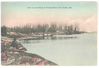 A postcard showing the rocky shore of the Poteau River with a pink and green sky over blue water. A man sits on the rocks at the shore and a houseboat sits in the water.