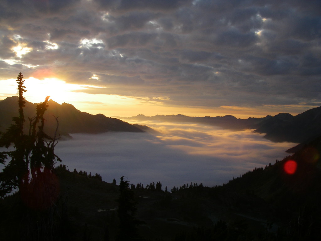 Mountain peaks and ridges rise from a valley basin, filled with clouds, illuminated by the rising or setting sun.