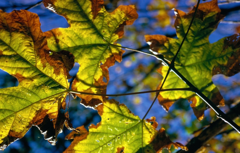 Maple leaves turning yellow and brown at the edges, with bright blue sky visible between them.