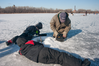 Two youth lounge beside a hole while Frank, a volunteer, tells them about the technology used by some ice fishers to find the fish.