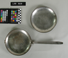 LIBI_00073_00809. A round tin fry pan and cover. The handle of pan folds over plate cover. Pans of this type were used to dig rifle pits and trenches at the Reno-Benteen battlefield defense position on the evening on June 25, 1876.