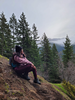 Woman sitting down on side of hill surrounded by trees, while admiring the view ahead.
