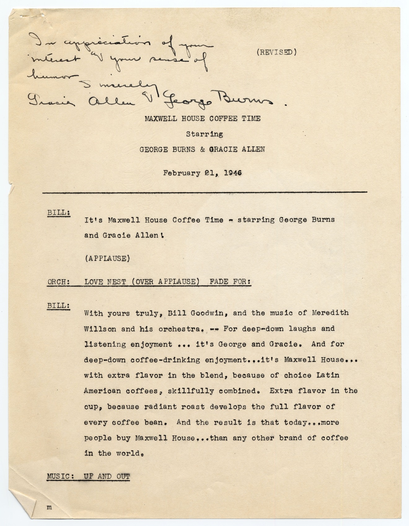 A script for the February 21, 1946 episode of the Maxwell House Coffee Time with George Burns and Gracie Allen. The script is signed by George Burns and Gracie Allen. It was sent to President Harry Truman. The plot of the episode is that George and Gracie's friend Harry needs help with an Orchard in Washington. When George and Gracie get Harry's letter asking for help the mistakenly believe that Harry Truman need George for a job in Washington D.C. Through this error George actually gets a phone call from D.C. asking him to visit. Only first page available for view online.