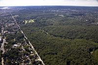An aerial view of Rock Creek Park showing hundreds of green tree tops with a river running through them.