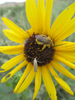 A yellow sunflower found at CHCU with a bee and many insects resting upon it. This photo was captured by Hillary Grabowska in July of 2017.