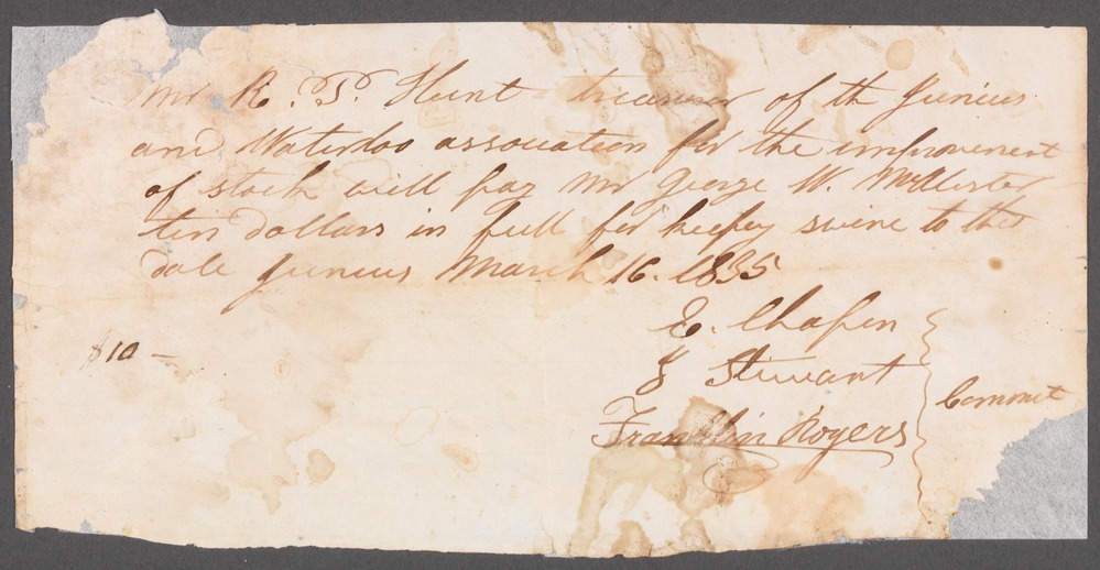 “Mr R P Hunt treasurer of the Junius and Waterloo association for the improvement of stock will pay Mr George W. Mc Alister ten dollars in full for keeping swine to this date Junius March 16th 1835 $10 - E Chapin, S Stuart, Franklin Rogers Comm’t”