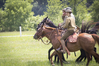 Three World War I living historians ride their horses during a cavalry demonstration.