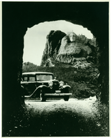 Black and white image of Mount Rushmore viewed through a tunnel on the Iron Mountain Road. A dark colored car is approaching the tunnel entrance traveling towards the photographer. The image is from early in the carving and shows George Washington's face with Thomas Jefferson's face to the left.