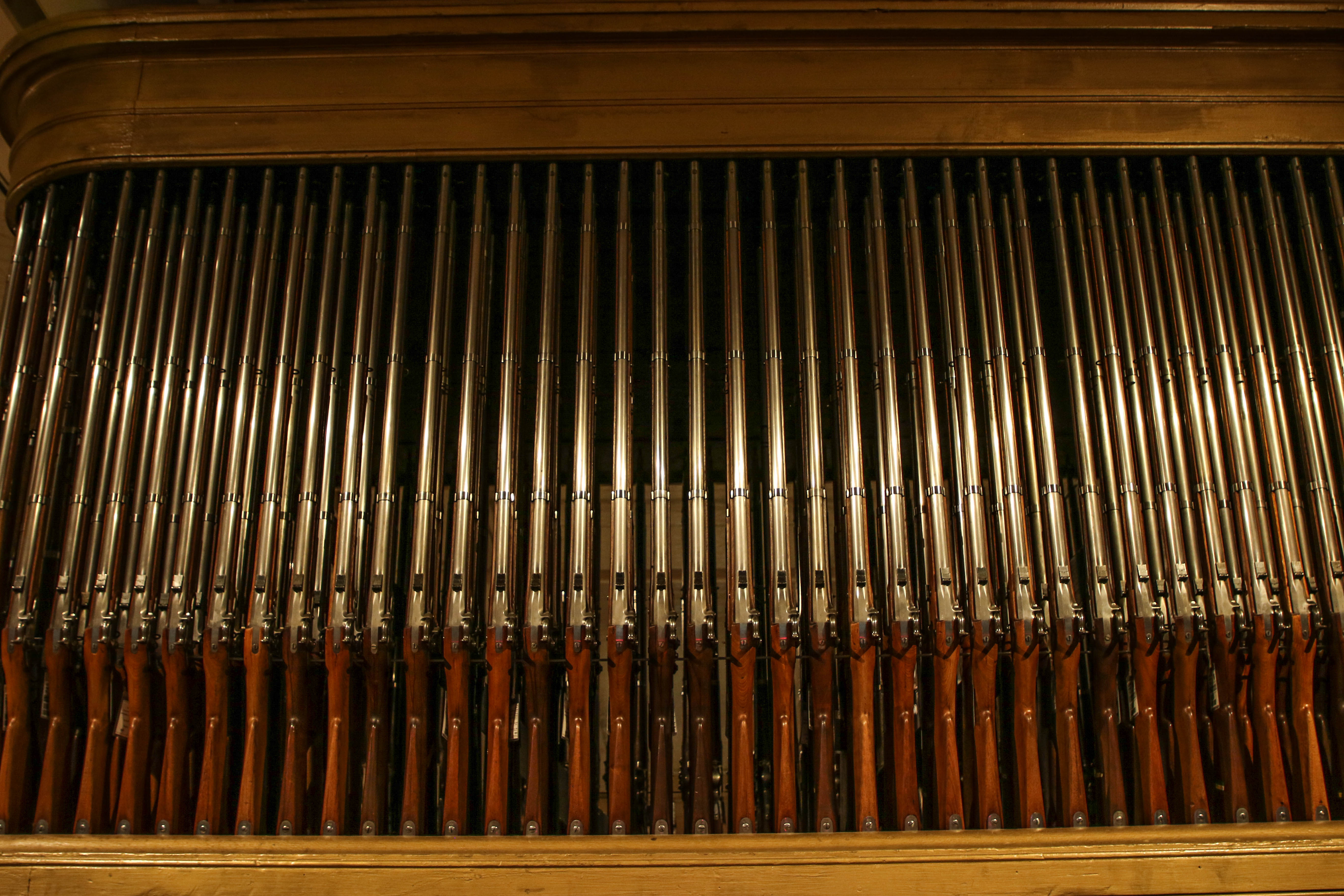 Museum exhibit of a line of rifles