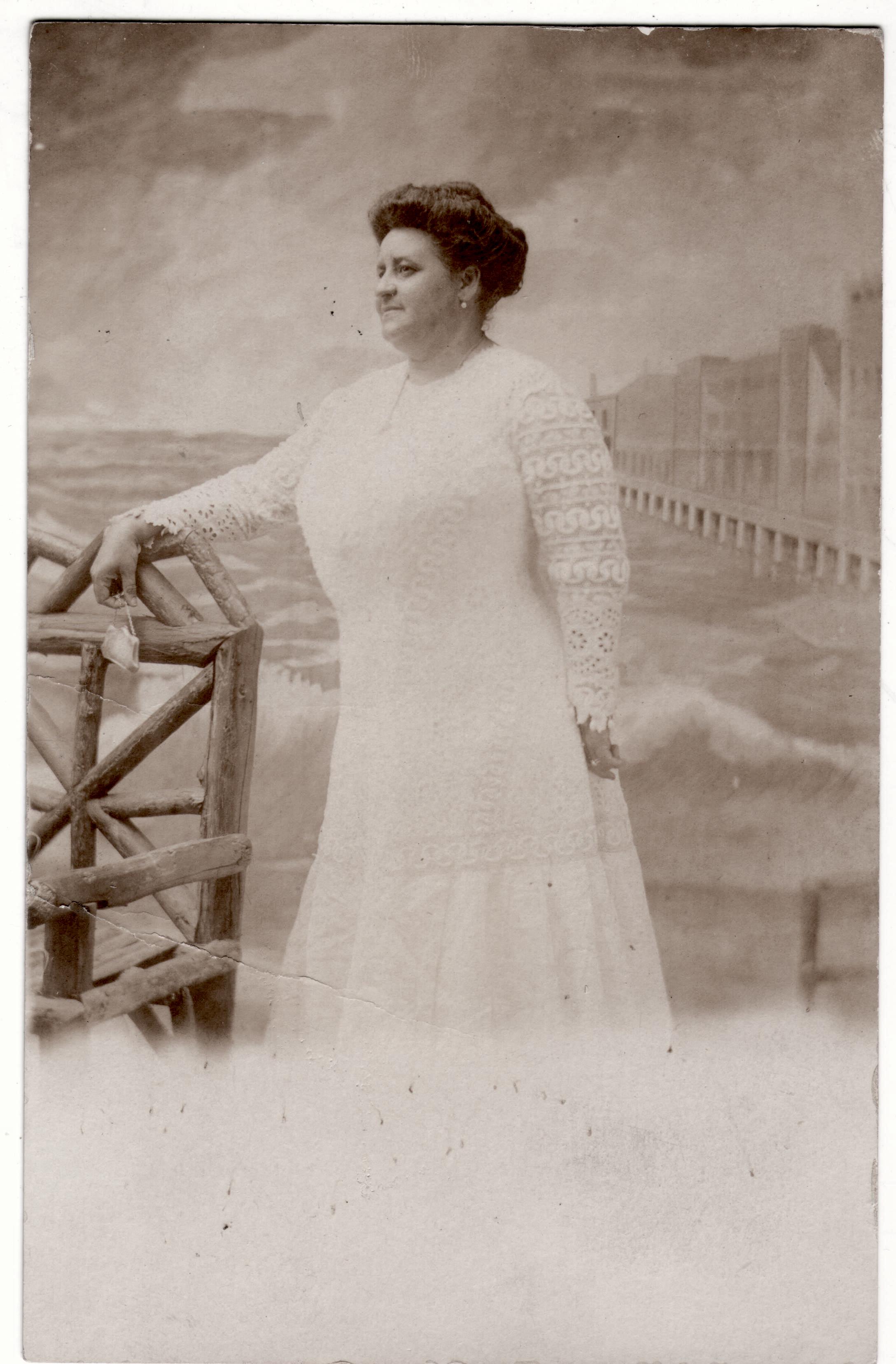 Photo postcard of Maggie L. Walker on Atlantic City Boardwalk with a painted backdrop, c 1917.