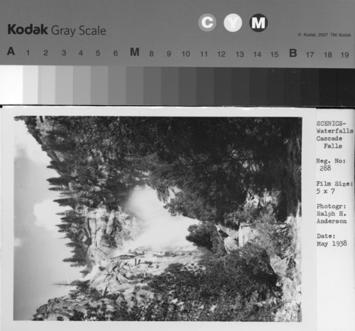 Telephoto view from Cascade Fall from Wawona Rd. for use as lantern slide show showing Douglas Fir.