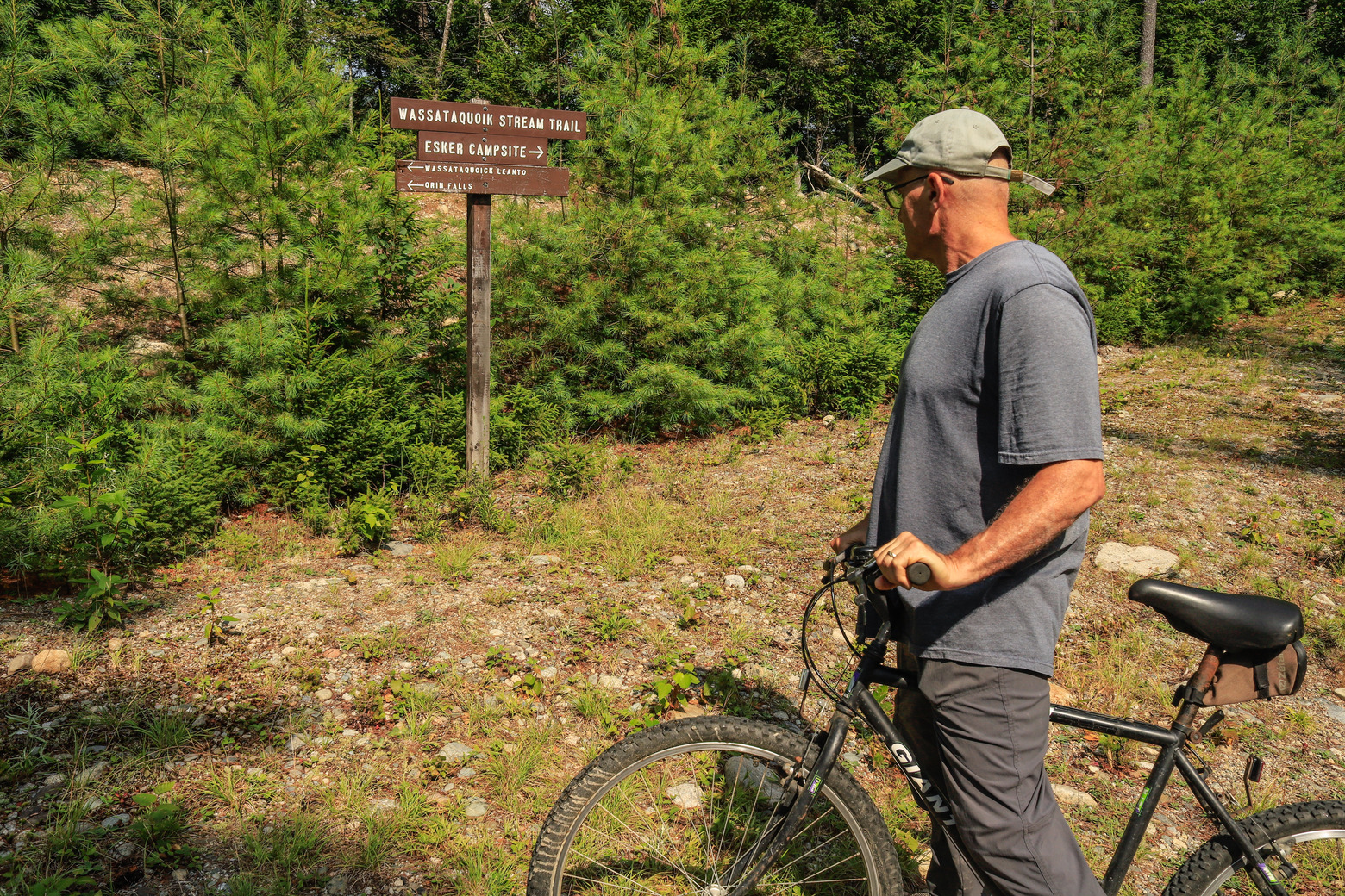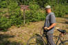 A man standing with a bike looks at a directional sign at a break in the path