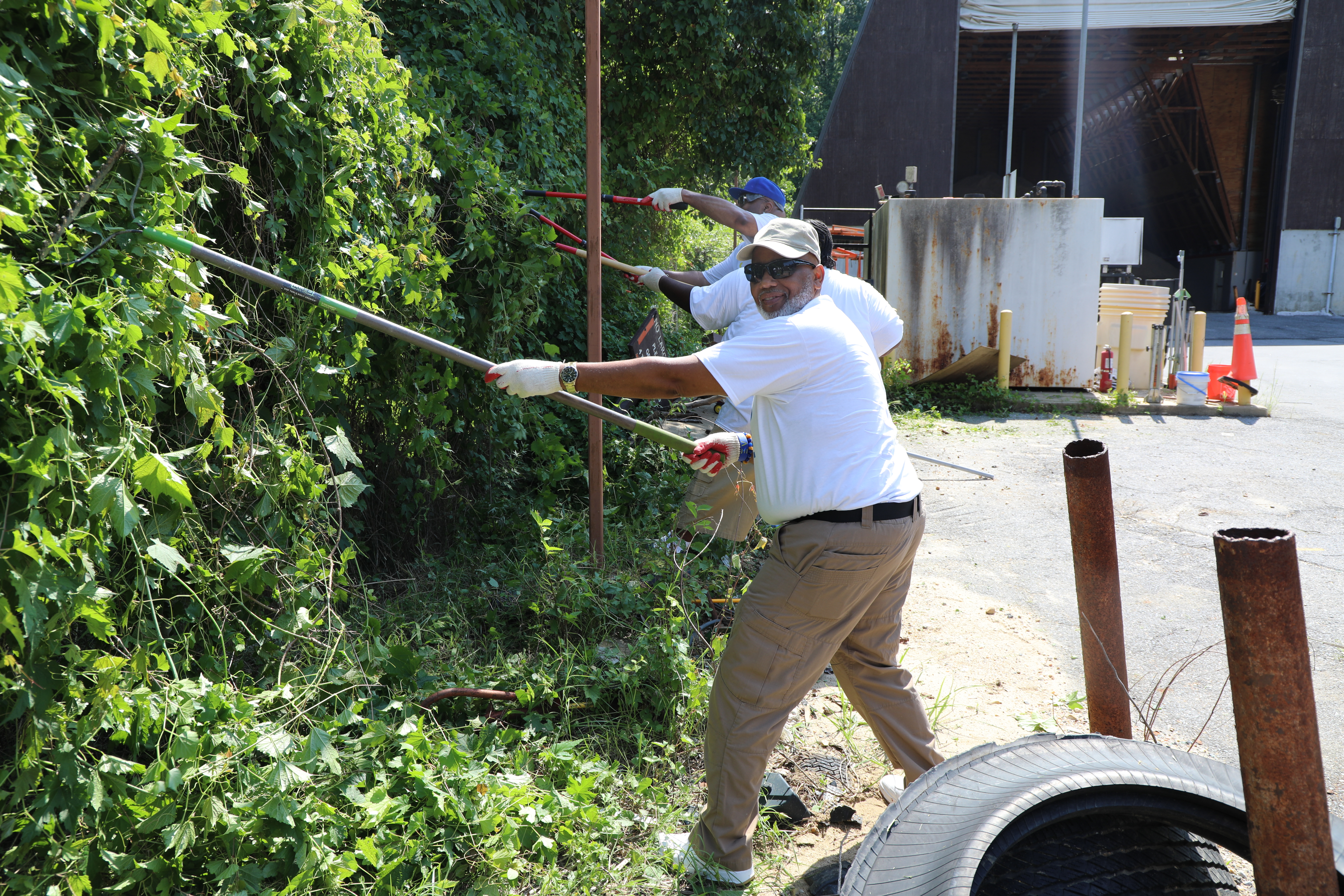 A volunteer looks at the camera as he pulls vines off a fence with a rake.