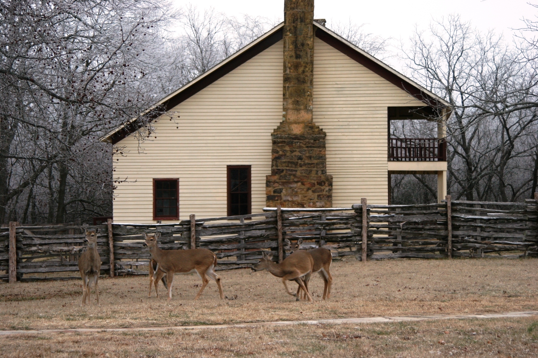 Deer visiting the Elkhorn Tavern. Deer are numerous and spotten often throughout the park.