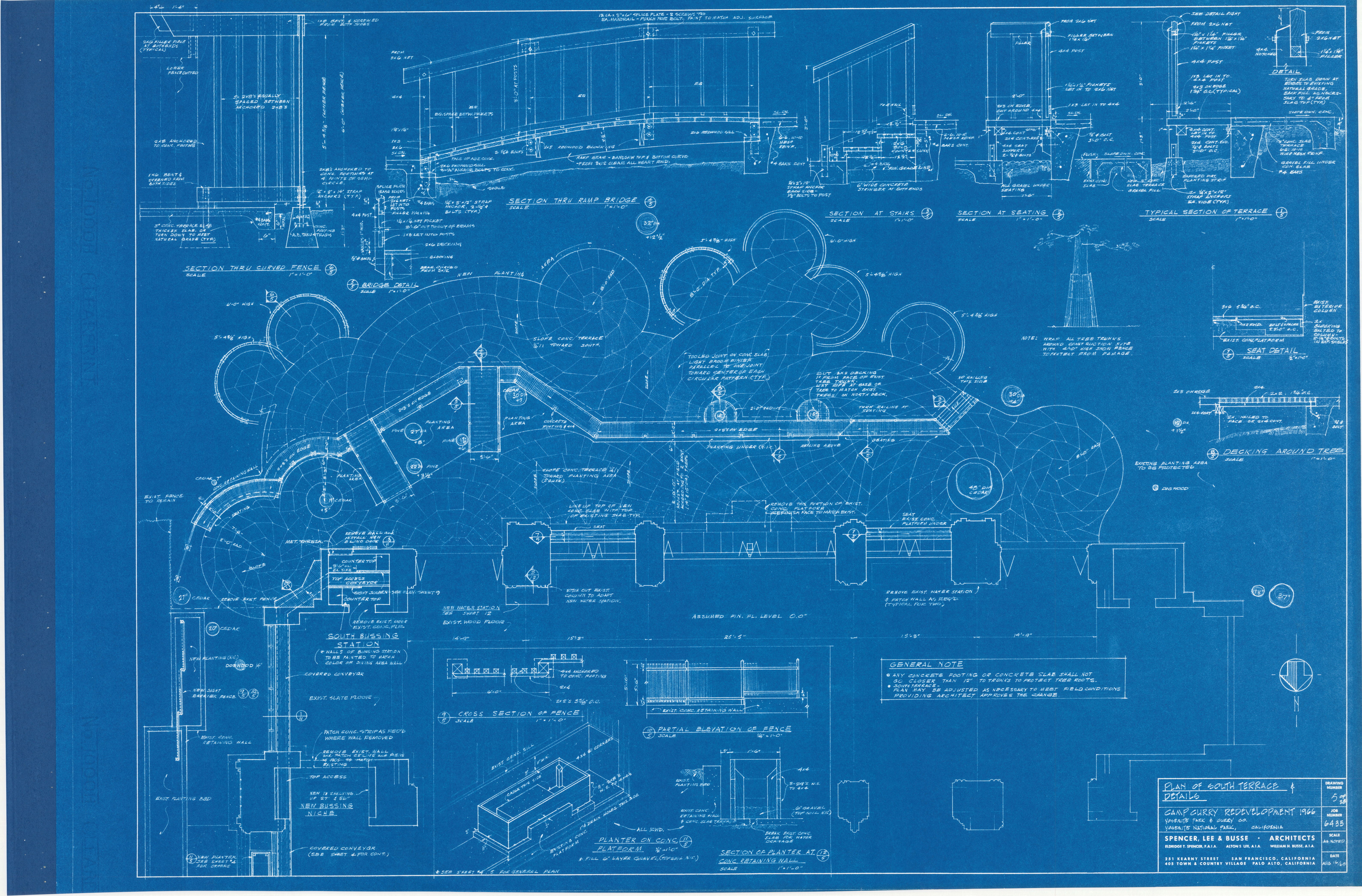 Blueprints showing architectural plans for the renovation of Camp Curry for Yosemite Park & Curry Co. including plans, sections, details of terrace, job no. 6435, sheet 5 of 28