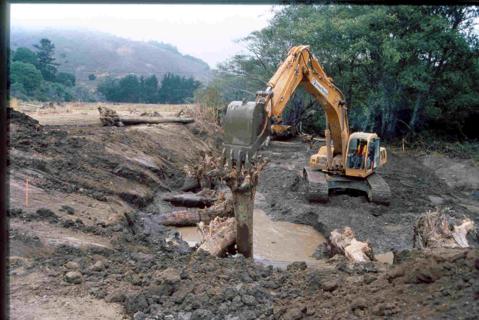 Installation of logs after berm removal for slope stabilization