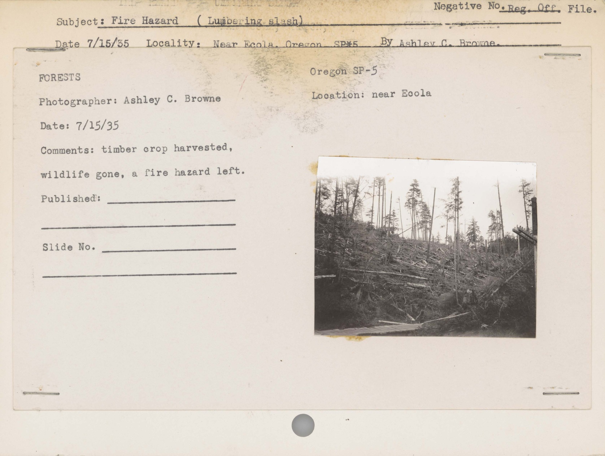 Fire Hazard (Lumbering slash). Locality: Near Ecola, Oregon . No Negative on File. Comments: timber crop harvested, wildlife gone, a fire hazard left.