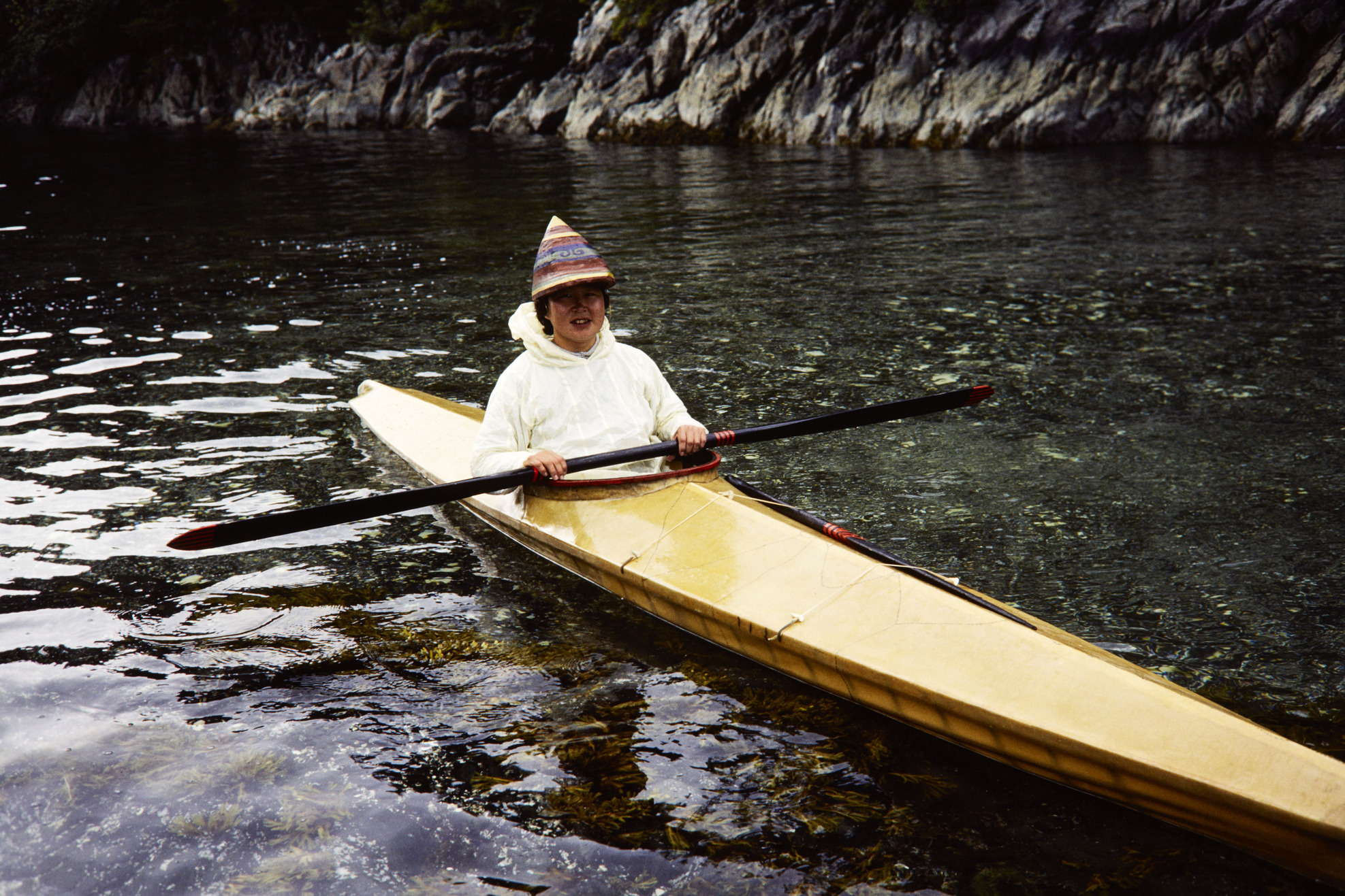 Alaska Natives. Woman sitting in a kayak in the water in the Alaska Region.