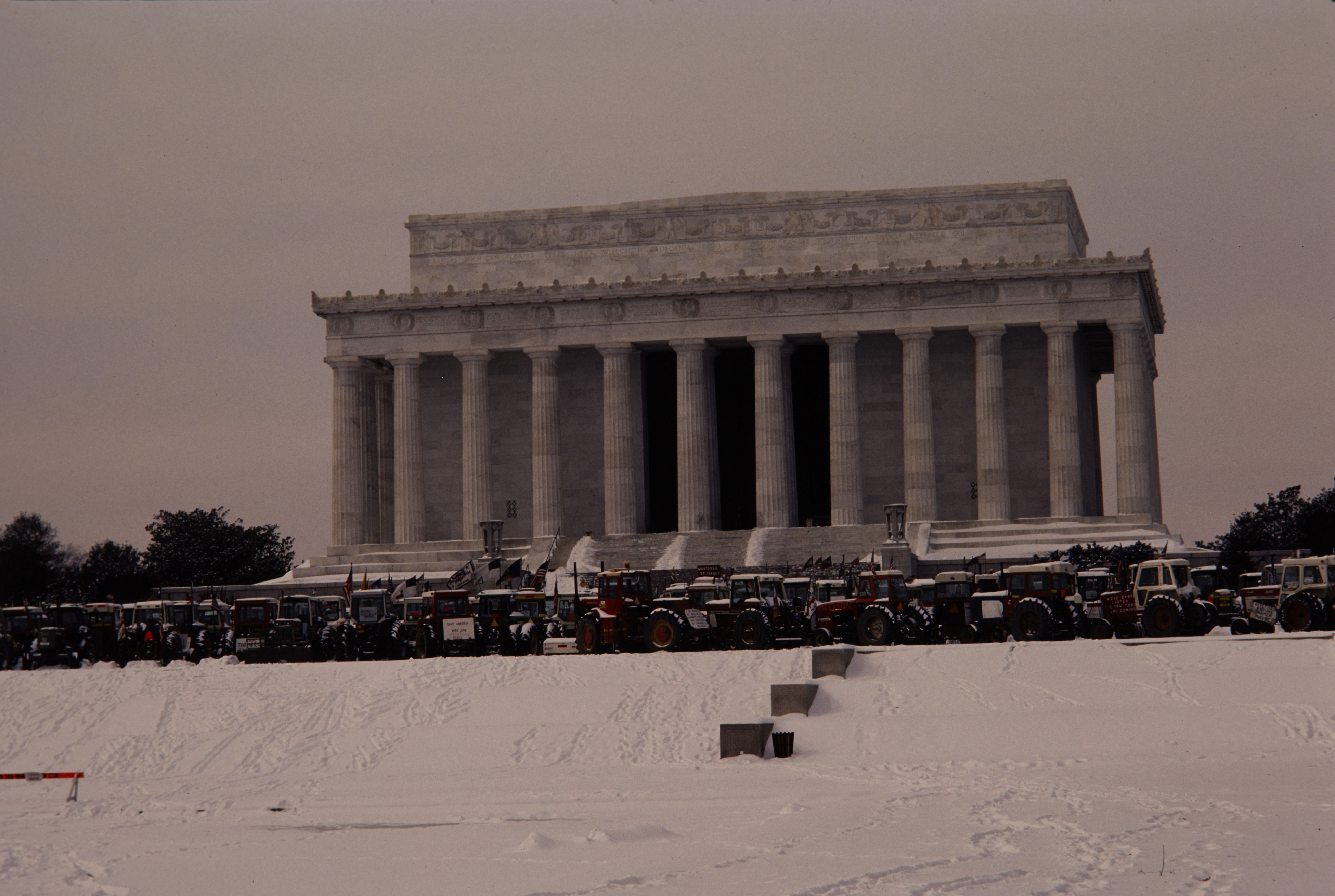Demonstrations. Protest consisting of a line of tractors in front of the Lincoln Memorial during the Carter Administration as part of the American Agriculture Movement.