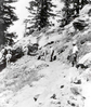 A crew of men with shovels and tools are spaced along a trail that follows the side of a steep, rocky slope.